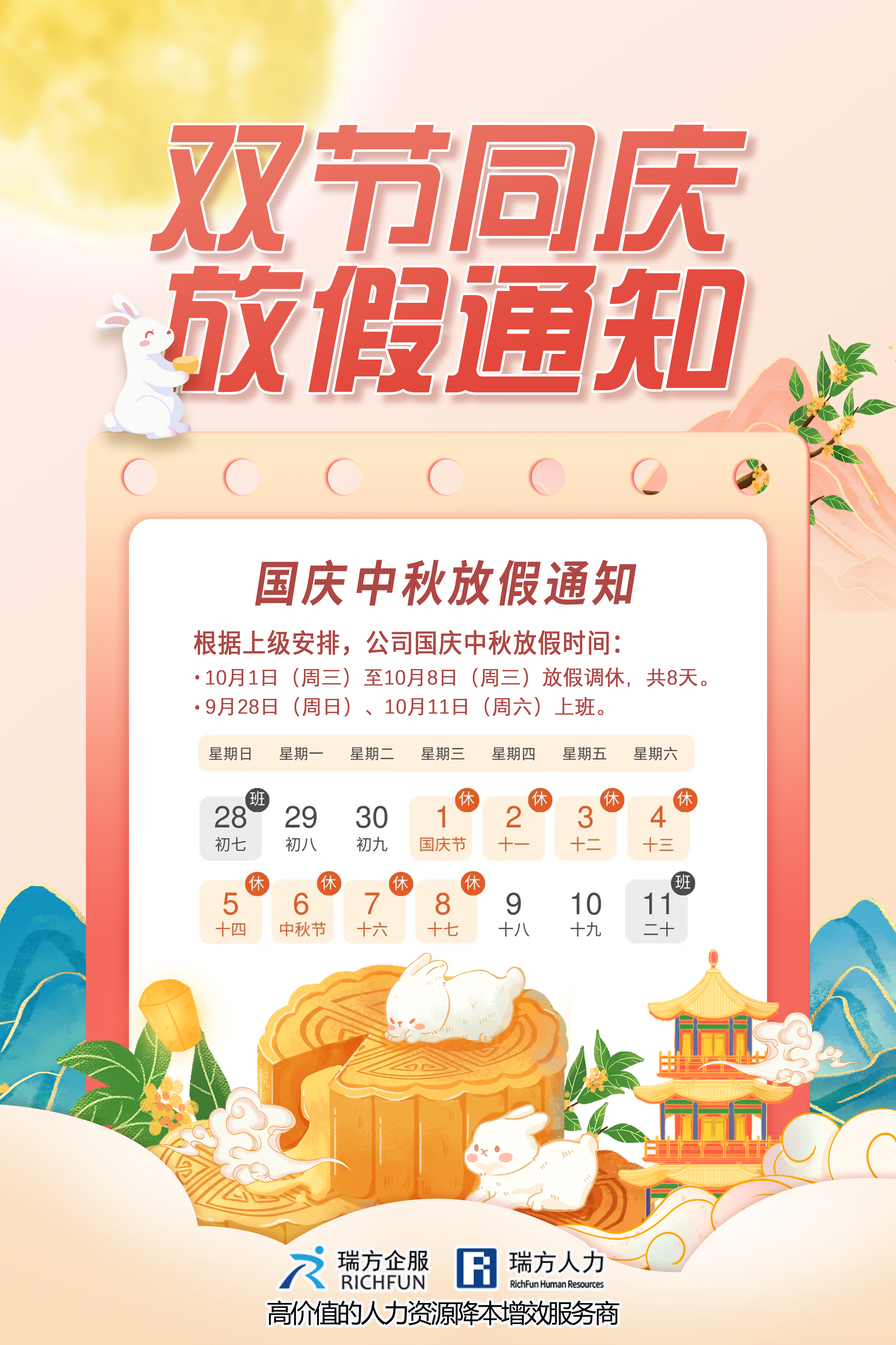 瑞方人力丨2025年国庆&中秋节放假通知